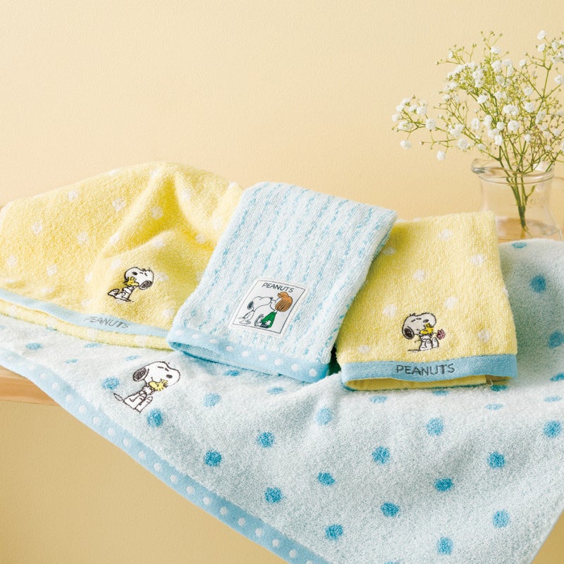 PEANUTSからハグをテーマに、スヌーピーが仲間に寄り添うシーンをモチーフにしました。ハグするスヌーピーから優しさや思いやりが伝わるデザインです。ドットとストライプのシンプルなパターンは子どもから大人まで使いやすく、内祝いにおすすめです。