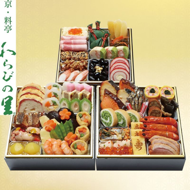 京都の料亭「わらびの里」が贈る彩り良い三段重です。焼魚や出汁を利かせた炊き物に加え、京都らしい食材を丁寧に盛付けております。寿の文字の入った玉子や梅の形の人参、金粉を塗した黒豆など見た目にも華やかに仕上げました。 【数量限定】