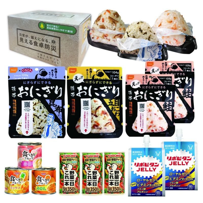 リポビタンゼリーC(栄養補給に配慮)、にぎらず作れる携帯おにぎり(手を汚さず食べられる三点カット方式・長期保存・国産米100%)、食べきりサイズのフルーツ缶詰、30品目の野菜350g分を使用した「カゴメ 野菜一日これ一本」を詰め合わせました。