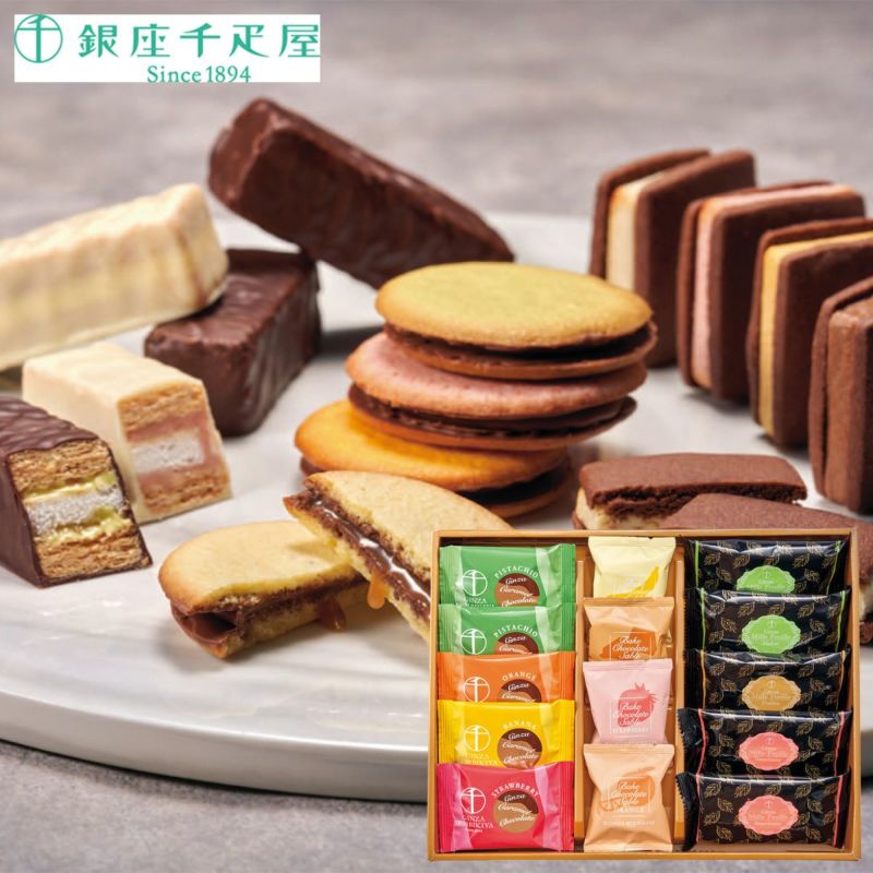 チョコレートでキャラメルを包み込みサンドした銀座キャラメルショコラと、銀座ミルフィーユ、銀座焼きショコラサブレの詰合せです。