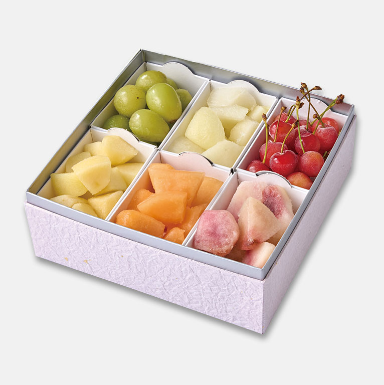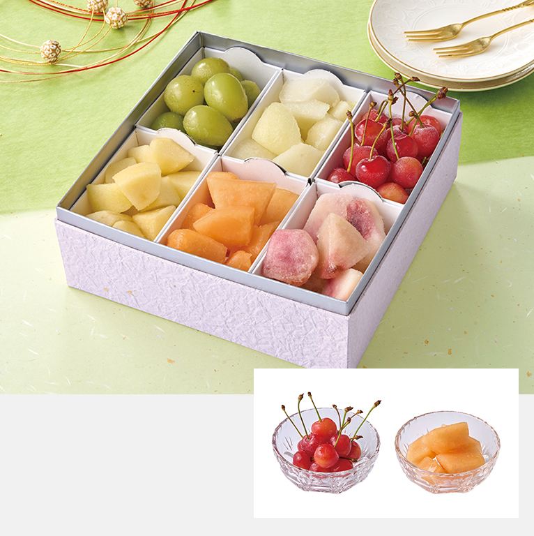 シャーベット感覚で楽しめる冷凍フルーツをお重に詰合せました。皮むきも不要で、1種類毎に小箱に入っているのでお好きな時に半解凍してお召し上がりください