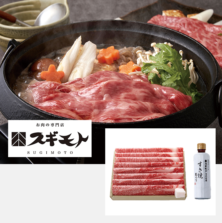 日本三大和牛のひとつ松阪牛。お肉の芸術品と呼ばれる霜降りの美しい肩ロースと肩肉をすき焼き用にスライスしました。老舗精肉店の「スギモト本店」監修の割り下でお召し上がりください。