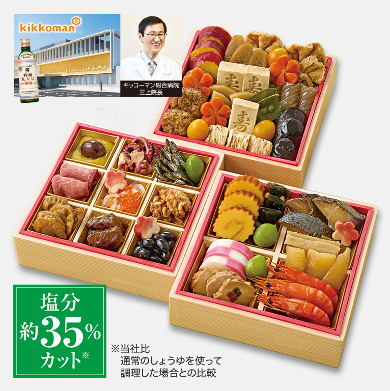 食の健康志向が高まる中、キッコーマン特選丸大豆減塩しょうゆを使用した減塩おせちです。