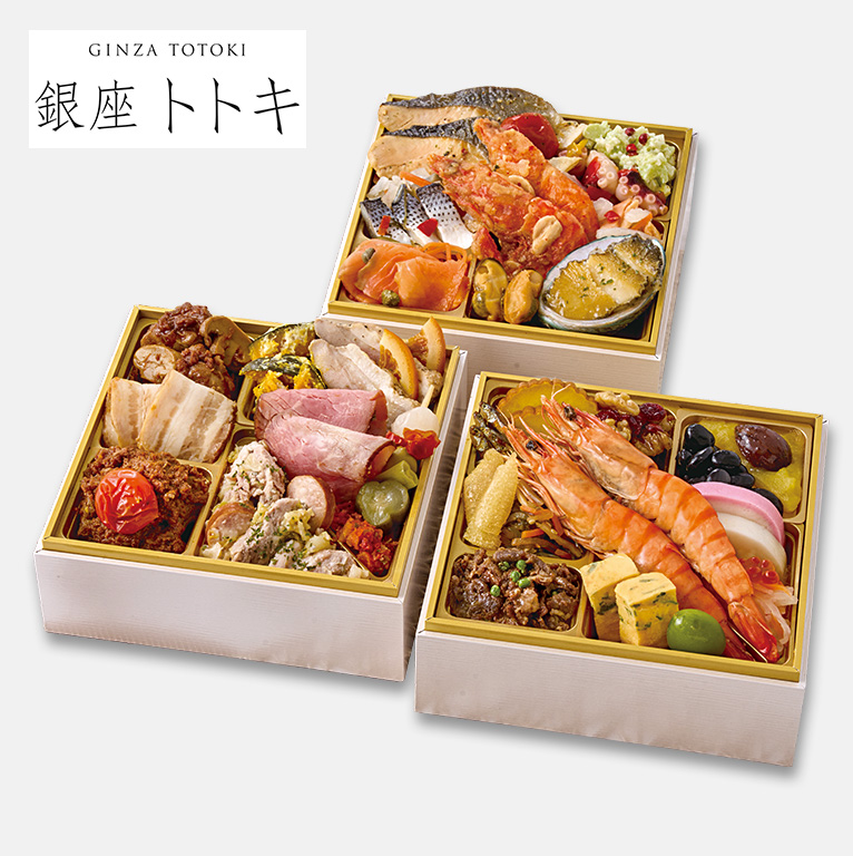 現代の名工受賞した「銀座トトキ」十時シェフが監修したおせち。一の重は、定番の和風おせち。二の重は、肉をテーマにした肉おせち。三の重は、海鮮をテーマにした海の幸おせちが楽しめる三段おせちです。