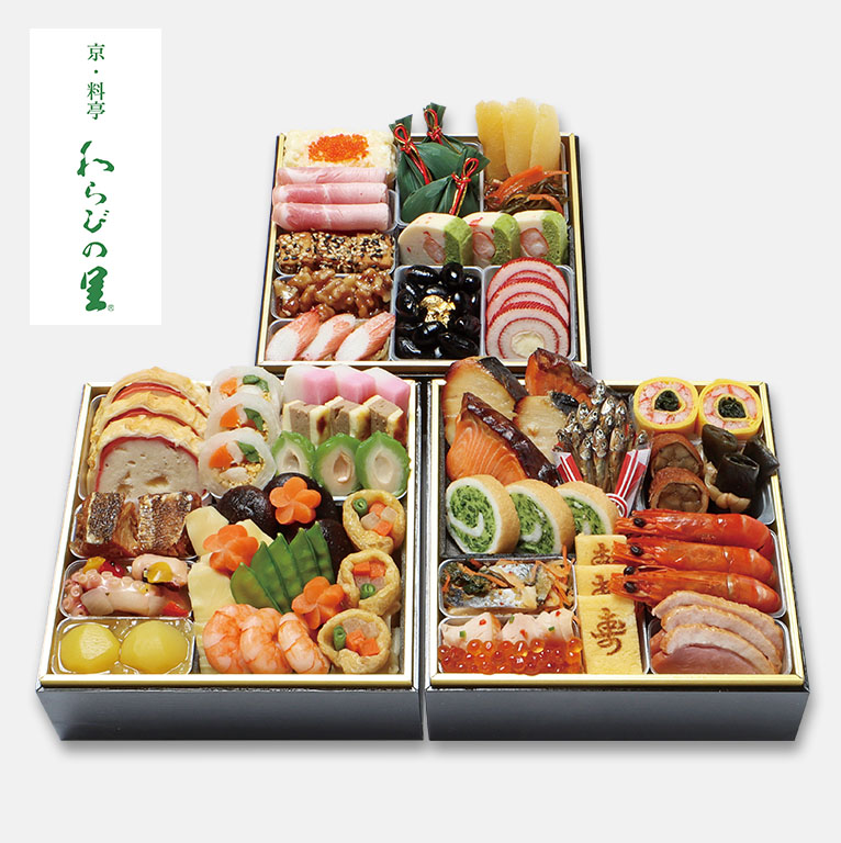 京都の料亭「わらびの里」が贈る彩り良い三段重です。焼魚や出汁を利かせた炊き物に加え、京都らしい食材を丁寧に盛付けております。寿の文字の入った玉子や梅の形の人参、金粉を塗した黒豆など見た目にも華やかに仕上げました。