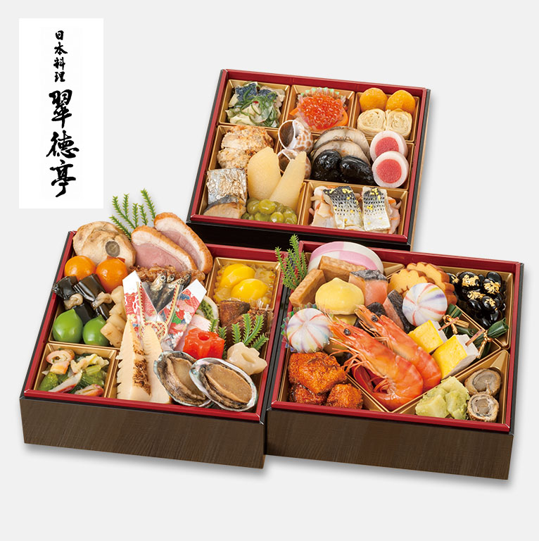 平成15年に厚生労働大臣表彰 現代の名工(卓越した技能者)、平成21年黄綬褒章を受賞した森口 冨士夫氏が店主の「翠徳亭」。卓越した技術を活かし、伝統的なおせち料理に仕立てた店主監修の三段重です。